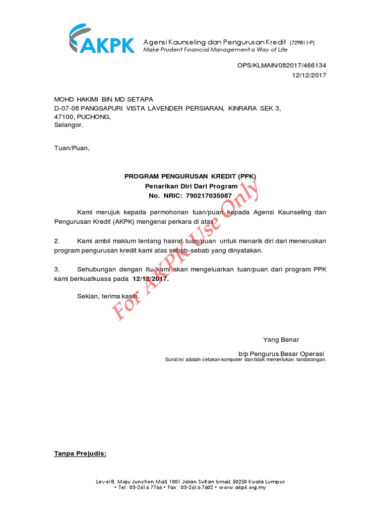 Kalau anda cari contoh surat keluar dari AKPK pun boleh dapatkan di sini. Unduh sebagai PDF TXT atau baca online dari Scribd. Terus risau tu belum 3 bank lagi nye statement.